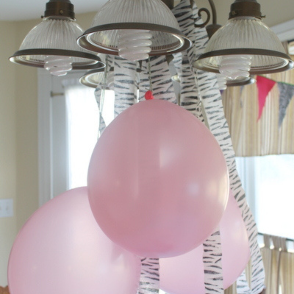 The original pin she found was pink zebra balloons and white zebra streamers hanging from a light fixture. I couldn't recreate the balloons for y'all, but I think my streamers turned out great. Best part of my streamers—they were free—I had everything I needed on hand.