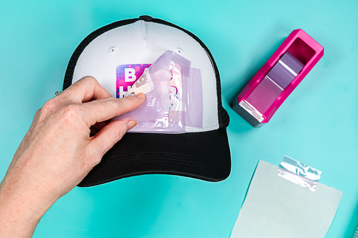 Then Cricut Heat will prompt you to press for 90 seconds for Infusible Ink. I always let the hat cool before adding my design just to avoid any ghosting. Be sure to trim the carrier sheet on your weeded design fairly close. You can even cut slits around the outside edge to help it curve. Then add the design to the hat where you would like it to be. Remember, it needs to be half-inch off the bill.