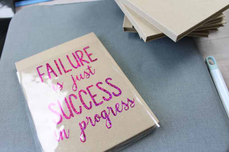 Now you just need to iron it on your notebook. The iron-on product I used had directions for adding to cardstock, and I used those in this case for ironing. If yours doesn’t have directions, start with a medium setting or around 275 degrees for about 20 seconds. You will also want to make sure that your clear carrier sheet covers the entire surface so you don’t get any burns. If it does not, just add parchment paper over the top to protect while ironing.