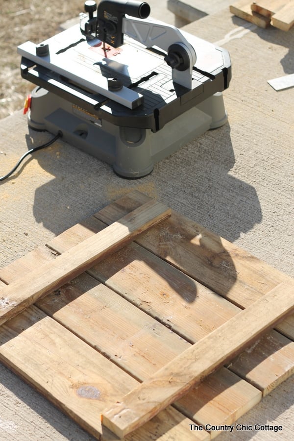 My sign is approximately 22 by 24 inches. I cut four of the used deck boards to 24 inches with my Blade Runner to get the main portion of the sign. A few boards that had been ripped were then cut for the back of the sign as shown below.
