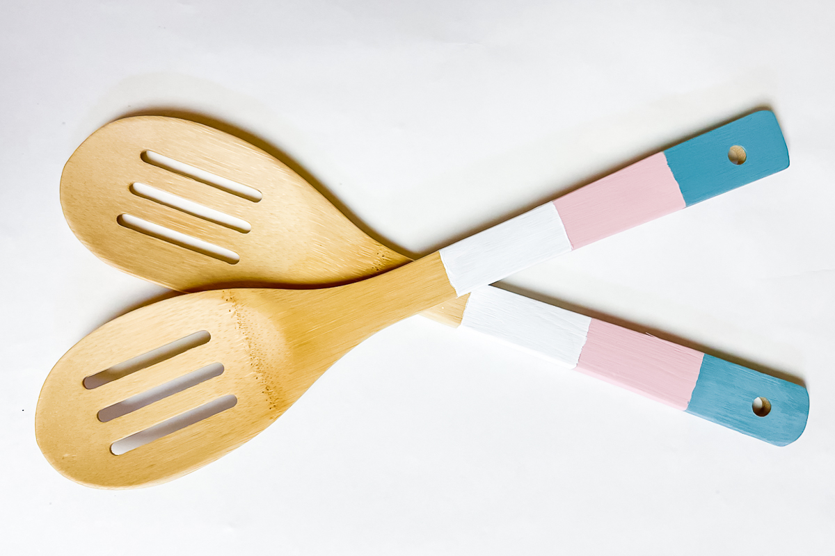 - Once all of the sections are dry, remove the tape! Notice how I kept the paint far away from the actual spoon end of the utensil. These paints are not food safe and should not be placed into contact with food.