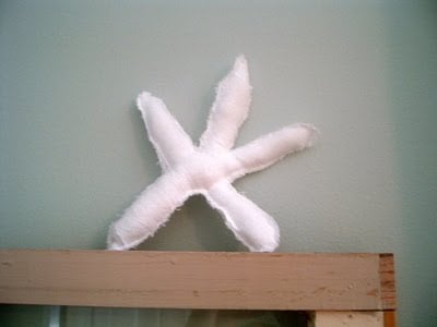 I took a piece of a tea towel I had leftover from a pillow project. Traced around one of my real starfish and cut out two pieces.