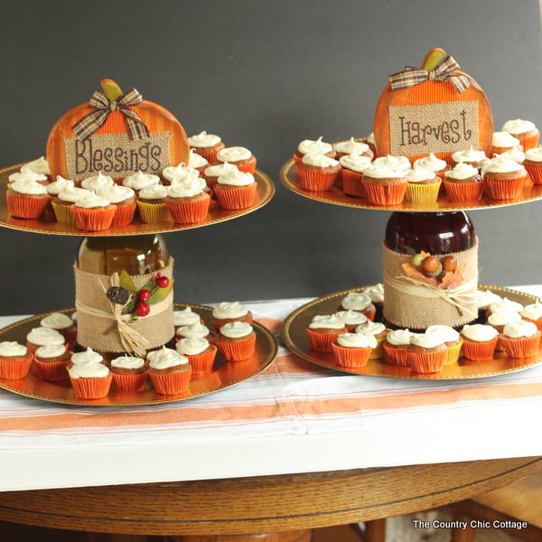 A DIY dessert stand like this idea is a fun way to serve dessert to a crowd and make a gorgeous display at any fall party. Make your own version in minutes with simple supplies from Dollar General.
