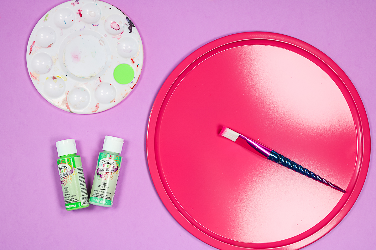When your pan is fully dry, continue by adding the green “ring” portion. I used the Avocado green color and painted the outermost edge of the pizza pan. Brush on light coats and allow each coat to dry before adding additional coats. I ended up with about four coats in this area.