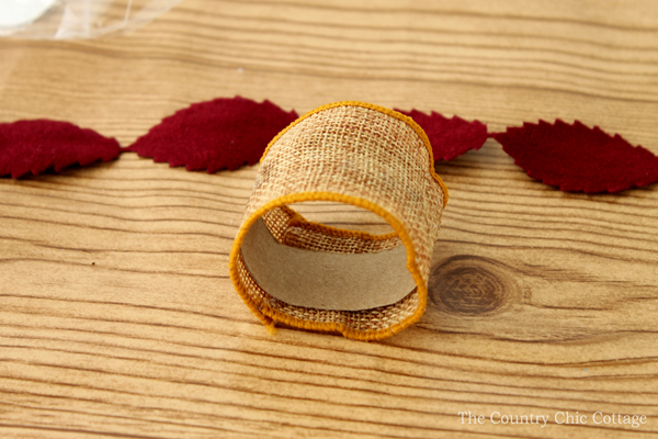 Add the felt leaves on top of the burlap and again use hot glue to secure.