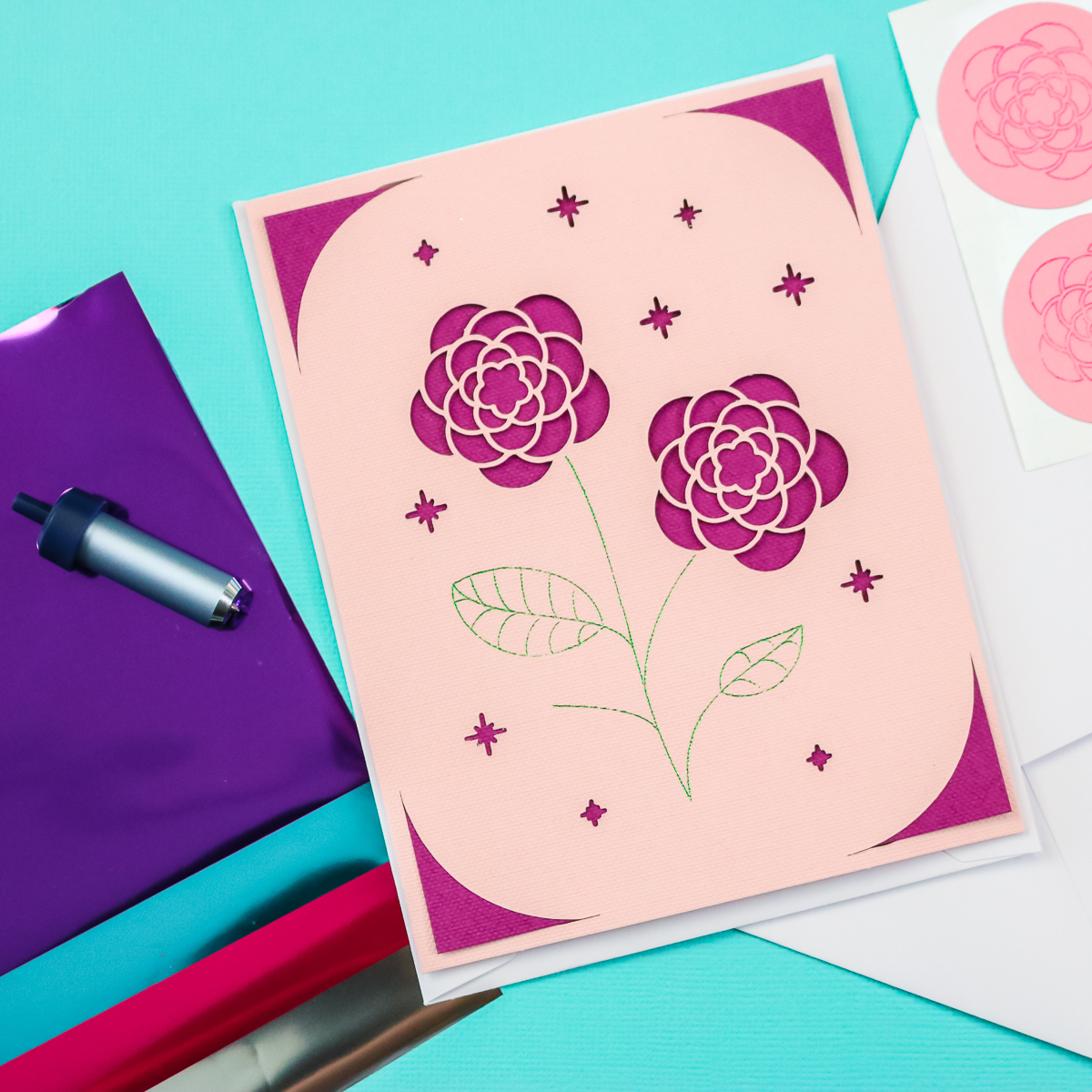 Then, we’re going to make paper stickers. I used the card design and sliced away one of the flowers. Then just change that from a cut to a foil. Add a circle and attach the foil lines to the circle.