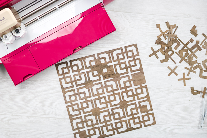 Pull up the cut file in Cricut Design Space and cut with your machine. Pick “natural wood veneer” from the custom materials list. This will run over the material four times to cut, so it will take a while. I like to check my cut before removing it from the machine. To do this, pull up a corner of a cut piece with a weeding tool. If it lifts easily, eject the mat from your machine; if it does not, press the “C” button to repeat the cut.