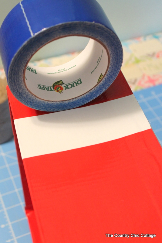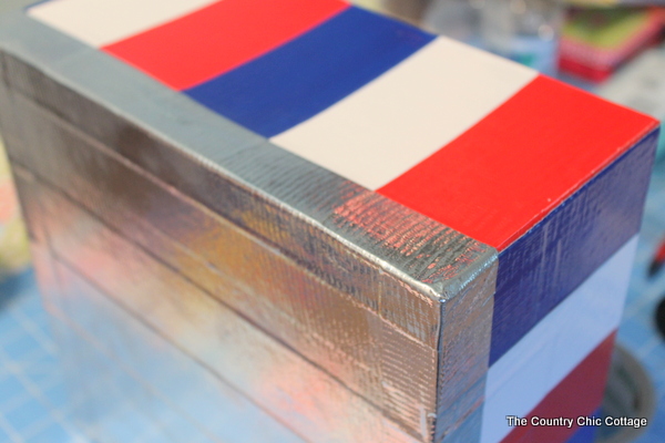 Now we are going to make those sides red, white and blue. Leave the “red” area alone then add a white stripe. I used the blue roll to get the spacing correct as shown. Go all the way to the top of the box and fold over any excess to the inside of your box. Again make sure there are no wrinkles or fold in your tape to ensure an amazing finished product.