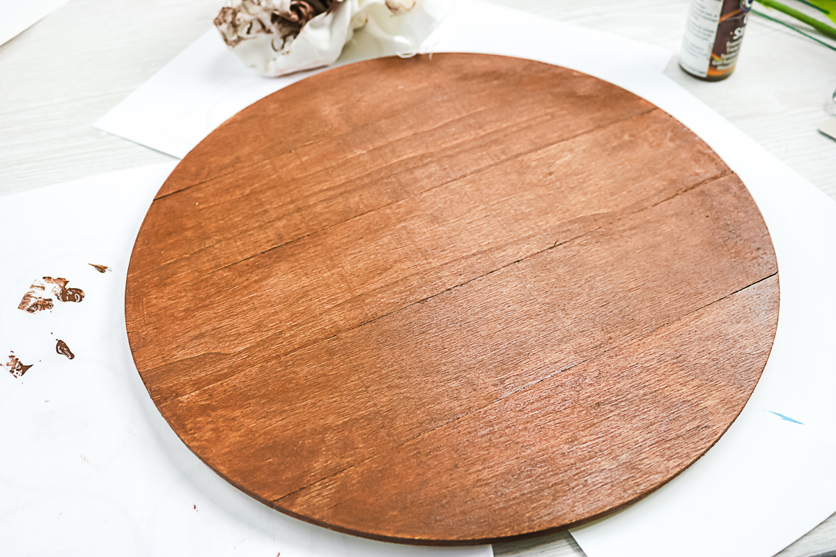 Start by staining the wood circle with wood stain. Brush the stain on, allow to sit for a few minutes, then wipe away all excess with a rag.