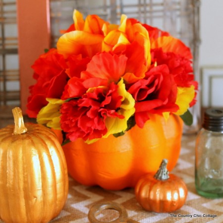 Poke the ends of your faux flowers directly into the pumpkin, varying colors, for a gorgeous display!