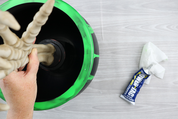 TIP: You may or may not need a foam block inside of your Halloween treat bucket. If the hand is not long enough to come out of the top, find a foam block to lift it up. I needed one.