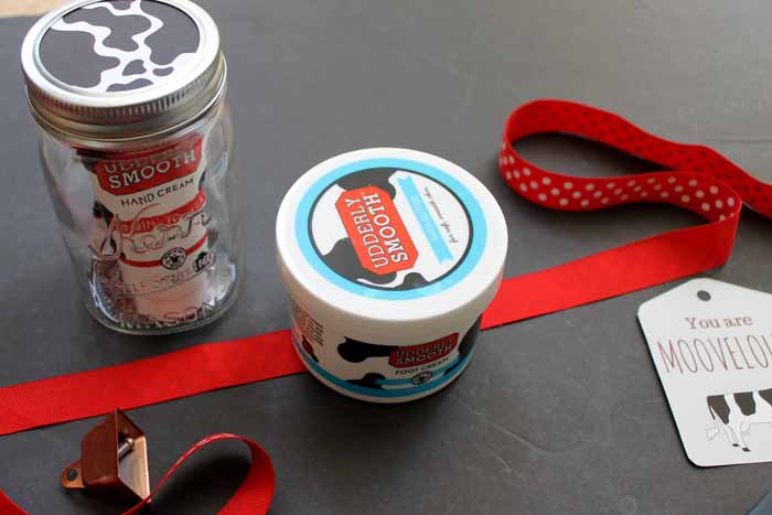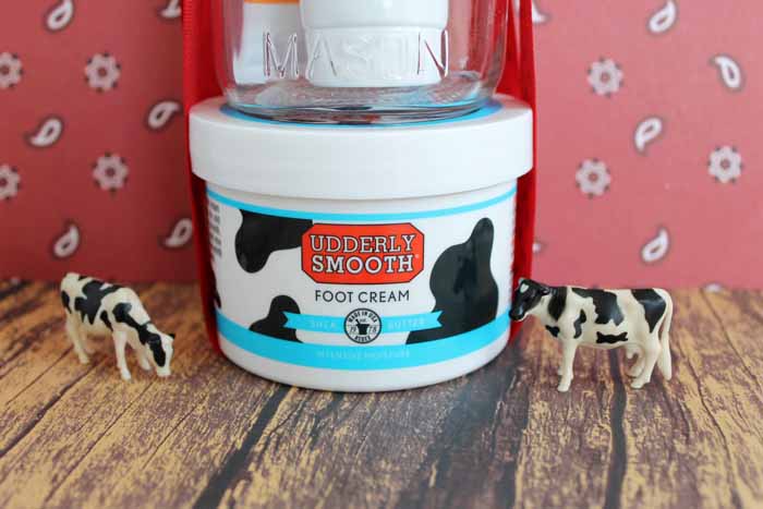 - Now it is time to add your pampering gifts!I put a couple Udderly Smooth small tubes in the large mason jar. They have a ton of varieties including hand cream, foot cream, an extra care formula, and of course the original udder cream.