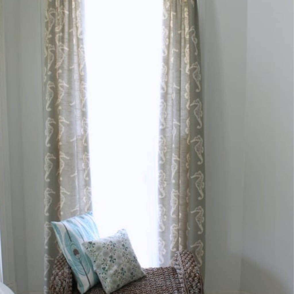 NOTE ABOUT THE FABRIC: The fabric for these curtains is a sea horse print in coastal gray from Online Fabric Store, and I just love the pattern! This fabric is 54 inches wide (please note this for future reference below).