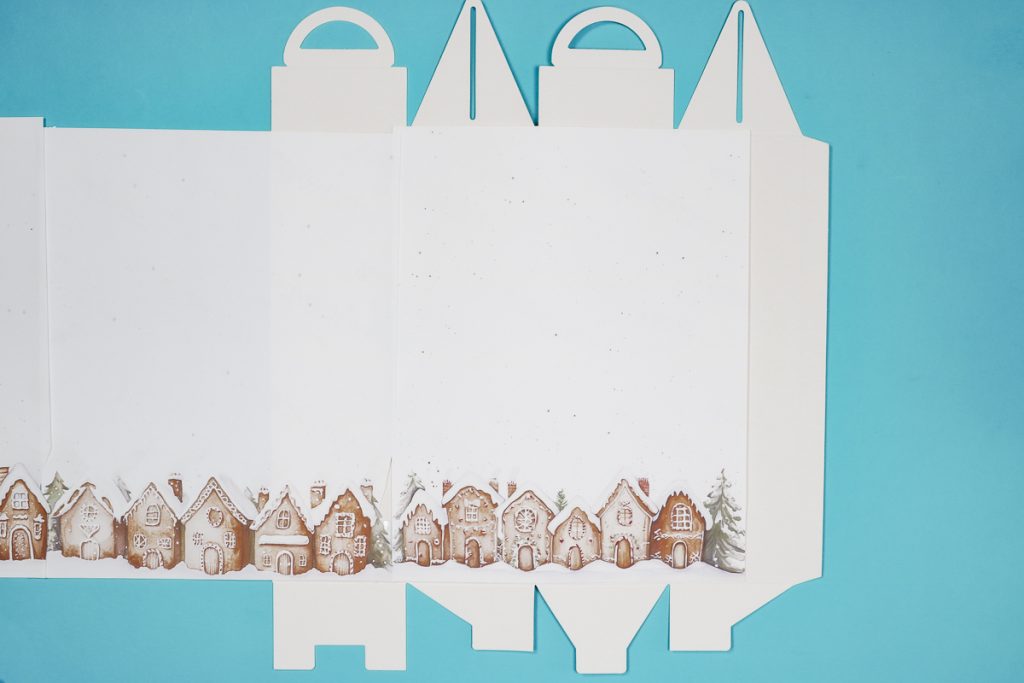 The prints I’m using today are printed on a full 8.5 by 11-inch sheet of paper. The main design is the gingerbread houses but there are little dots above the houses that add a little extra to the boxes.