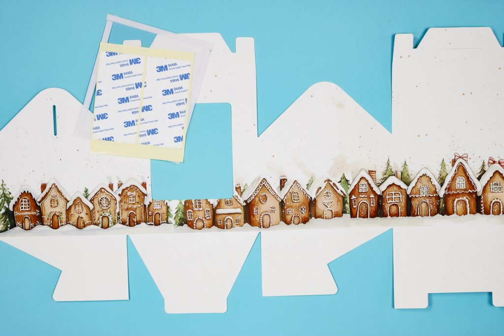 I am using three of the prints for my first box and I’ve lined them up so they look like one continuous line of gingerbread houses. I lined up the bottom of all the houses and they look great. You can arrange the pages however you want.