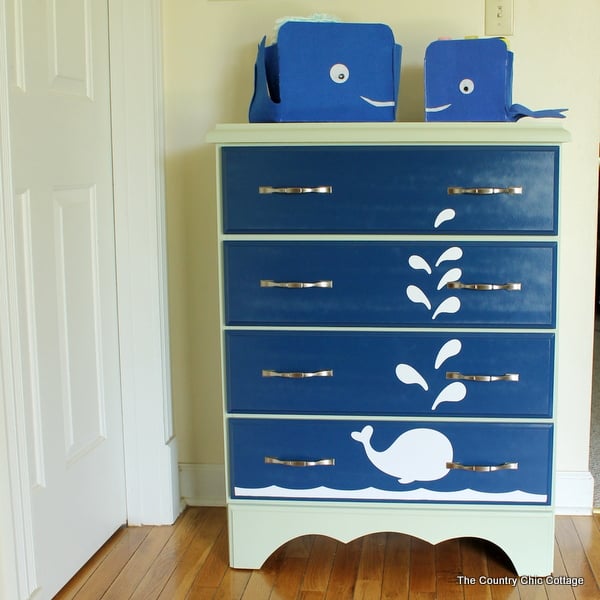 After creating the file, I used my Cricut machine to cut the whale and water out of white adhesive vinyl. I then added the vinyl to the drawer fronts using transfer tape and a scraper.