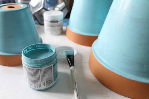 Start by painting your flower pots in the color of your choice. They may take two to four coats before getting complete coverage. Allow the pots plenty of time to dry before moving outside.