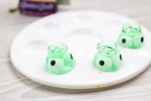 Pour the green resin into the globes until the candy eyes are completely covered. I actually didn't worry about any bubbles during this project as a few will actually add to the look. You then need to let these cure completely. Allow to sit overnight.