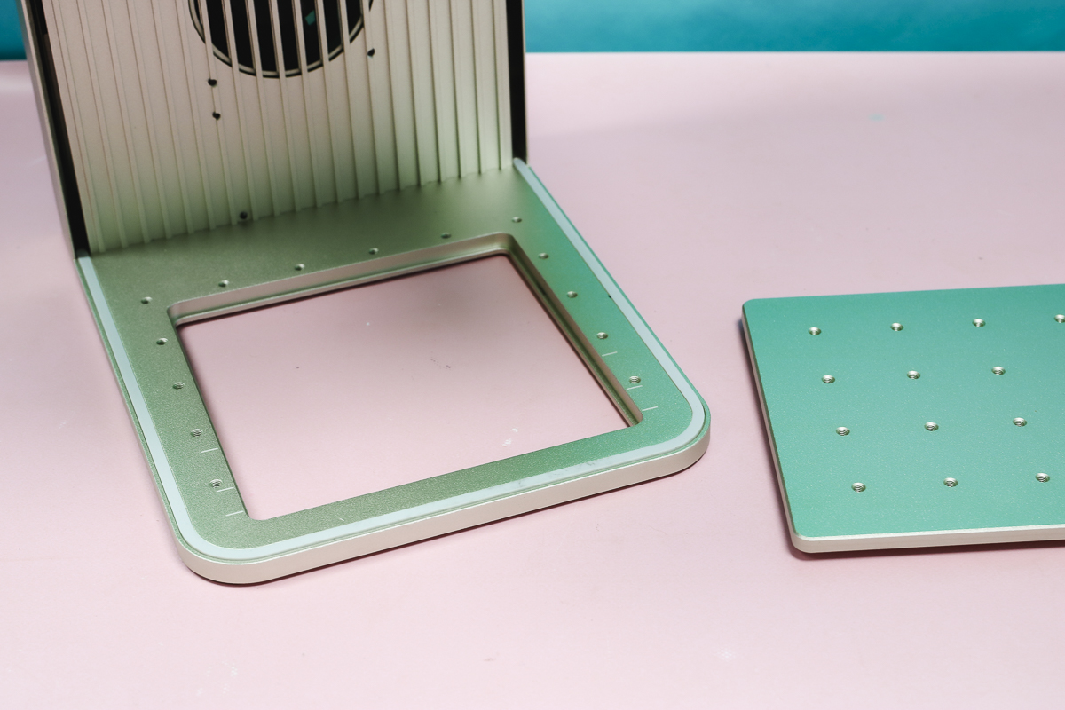 When you open the laser there is nothing installed at the bottom of the laser. You can set the laser on top of surfaces and engrave them without a plate.